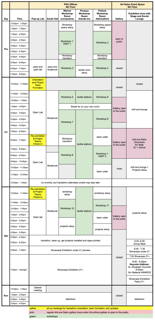 Below is our full, detailed schedule for ElectricSEA 2026 including workshops. Thursday, March 26th was for preliminary workshops and lab setup. The hackathon ran Friday and Saturday March 27th – 28th, ending with the Showcase Exhibition Saturday evening, March 28th. The first all up orientation meeting with team formation was Friday, with reorientation and team updates Friday evening and Saturday morning, so those arriving later could get up to date. Sunday March 29th was for project takedown.